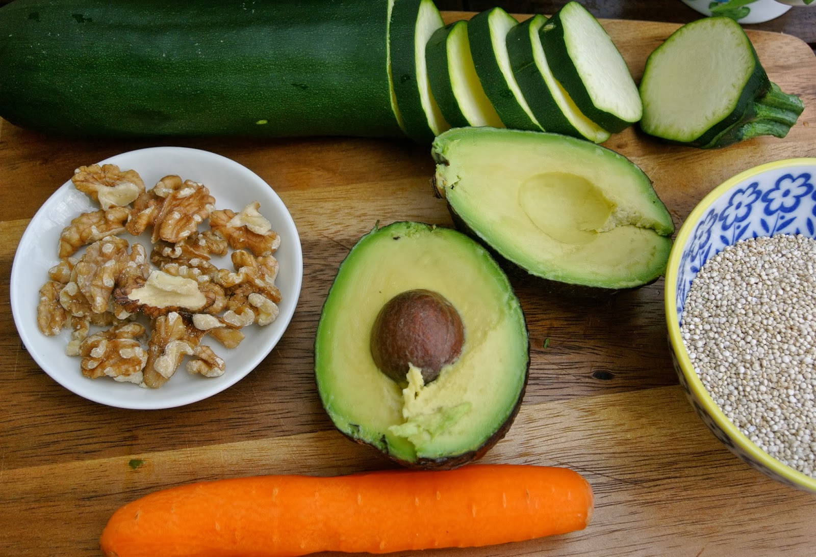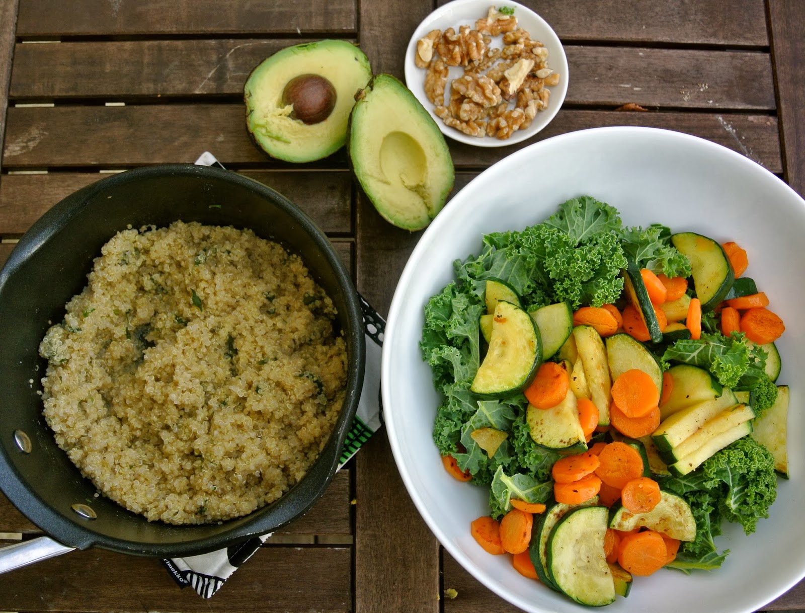 Huuhtele ja keitä kvinoa pakkauksen ohjeen mukaan. Samalla paista pilkotut kesäkurpitsa ja porkkanat kevyesti oliiviöljyssä. Lisää pehmenneiden kasvisten joukkoon valmis kvinoa, rouhittuja saksanpähkinöitä, pilkottu avocado. Mausta suolalla, mustapippurilla ja sitruunanmehulla. Salaatista tulee noin 2-4 annosta, riippuen nälästä.