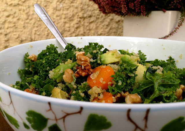 Tässä herkullinen ja nopea, ihoa hellivä lämmin salaatti kvinoasta, lehtikaalista ja avocadosta…ja muutamasta muusta 🙂 Lehtikaalia käytän tällä hetkellä ruokavaliossani lähes päivittäin. Se sopii hyvin niin vihermehuihin, smootheihin kuin salaatteihinkin. Siitä valmistuvat myös ihanat lehtikaalisipsit!