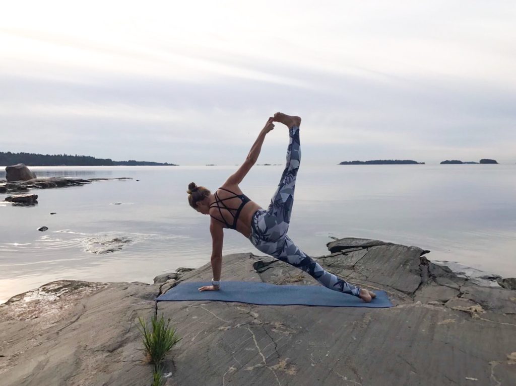 Näissä Sweaty Bettyn Contour Workout trikoissa, ei ainakaan ole trikoista kiinni, jos jalka ei nouse 🙂 Materiaali on ihanan pehmeä, aivan kuin ei olisi mitään jalassa. Vyötärö myös nousee korkealle ja pysyy hyvin paikoillaan- tärkeä ominaisuus! Trikoot on suunniteltu kaikenlaiseen treeniin, mutta itse pidän näitä joogatessa kuin muuten vain.