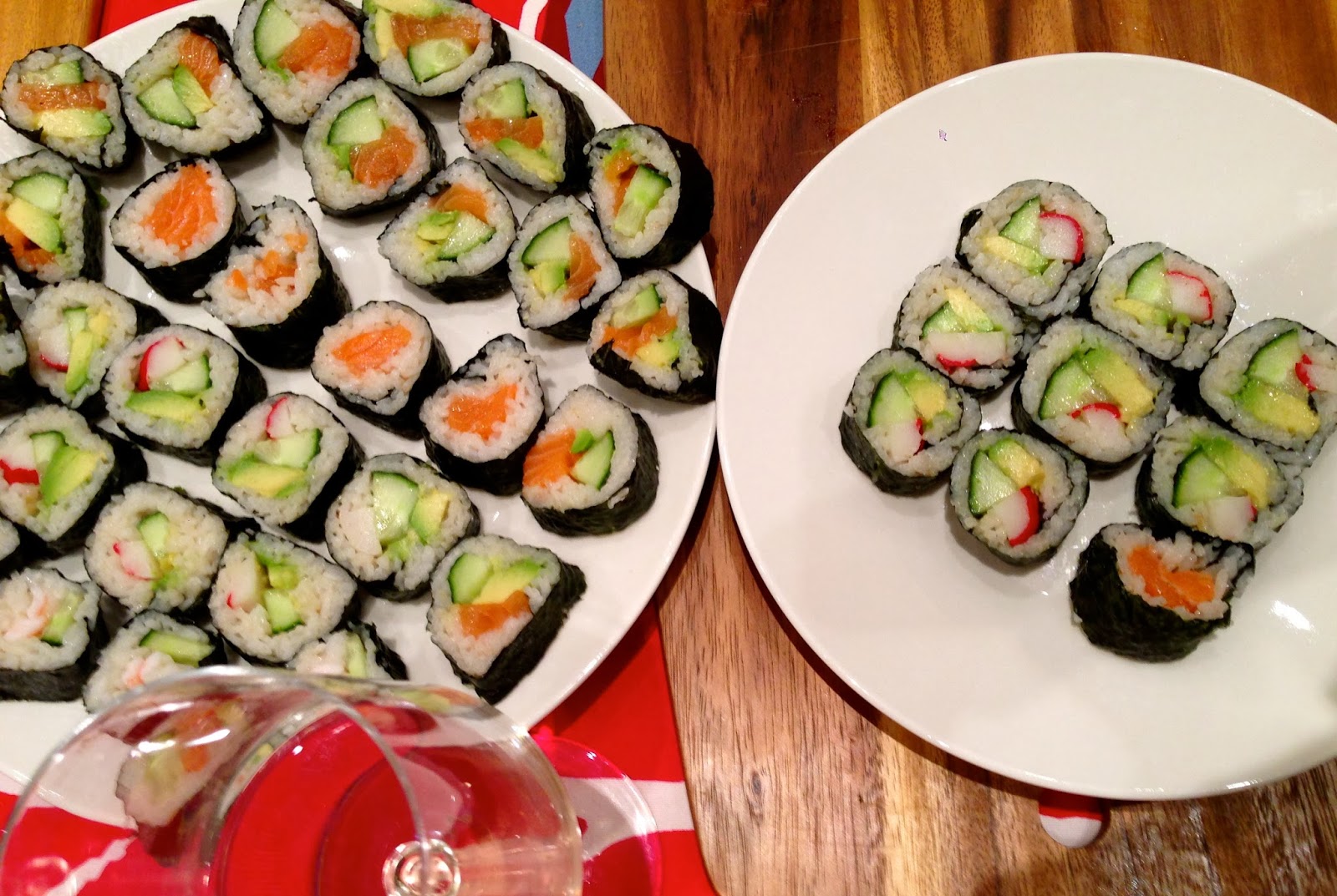 In our neighbourhood, we have a really good sushi restaurant, but yesterday we had an idea to make it by ourselves. Last time was about two years ago… I guess. The best part of making sushi is the time spending all family together, and the waiting if the rice will be like it should be; sticky and a bit sweet. I think, that cooking the rice is the most difficult part. My favorites are California rolls and slightly grilled salmon nigiri with a glass of good Chablis, my favorite french white wine.