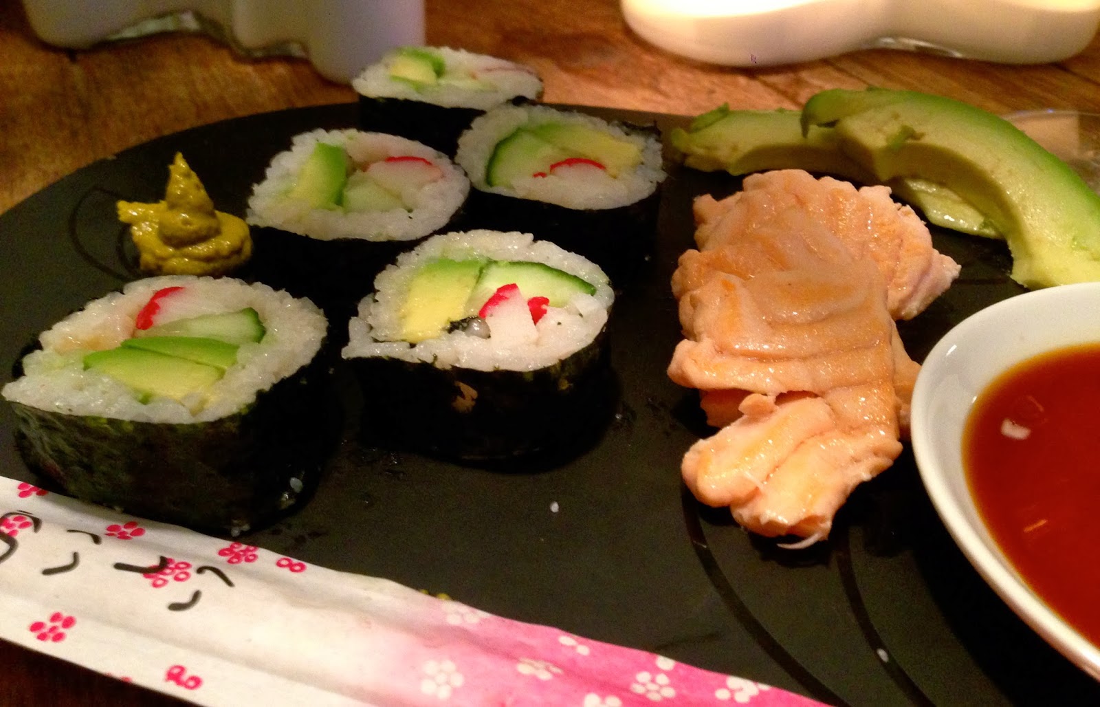 Omat suosikkini ovat California-rullat ja kevyesti paistettu lohi nigiri. Tällä kertaa kaikki riisi meni rulliin, mutta ainakin omasta mielestäni lohi maistui paremmalta ilman riisiä. Sushien kanssa maistui myös lasillinen ranskalaista Chablieta, joka on mielestäni yksi parhaimpia valkoviinejä.