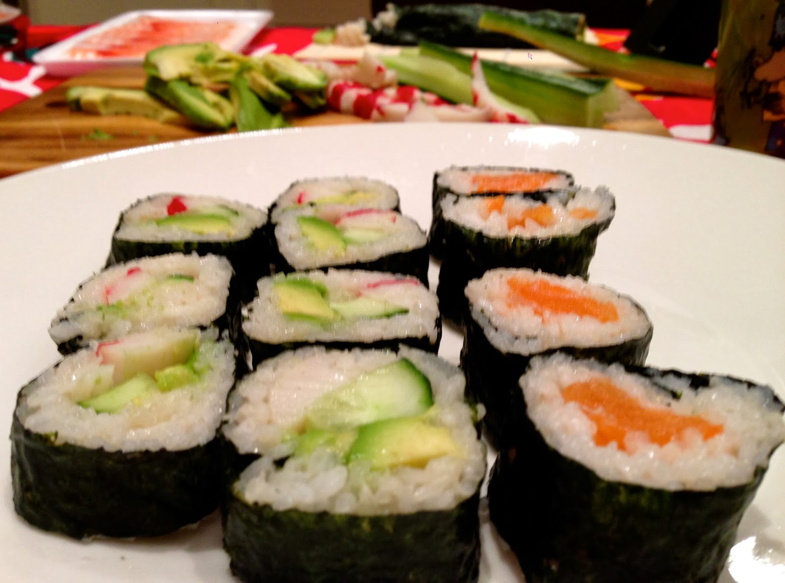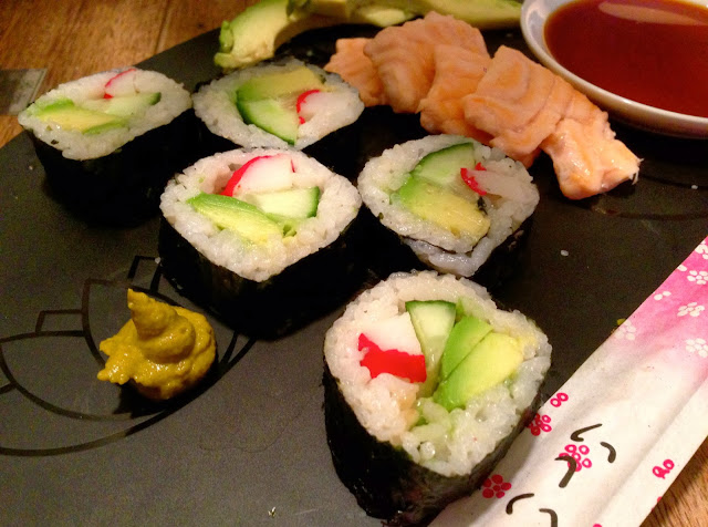 Naapurustossamme on aivan ihana sushi-ravintola, joka helposti maussa pesee hienoimmatkin sushi-ravintolat. Mutta eilen innostuimme taas pitkästä aikaa tekemään omat sushit. Viime kerrasta onkin jo muutama vuosi. Parasta kokkailussa on tekemisen ilo koko perheen kesken ja se pieni jännitys, onko riisi sellaista sopivan tahmeaa ja hieman makeaa, ja onnistuuko rullaus… Haasteellisinta sushin tekemisessä onkin juuri riisin keittäminen. Rullauksesta oli vielä mielikuvia sushikurssilta, joka oli yksi kolmekymppisteni “ohjelmanumeroista”- ja siis ihan vastahan niitä juhlittiin 😉