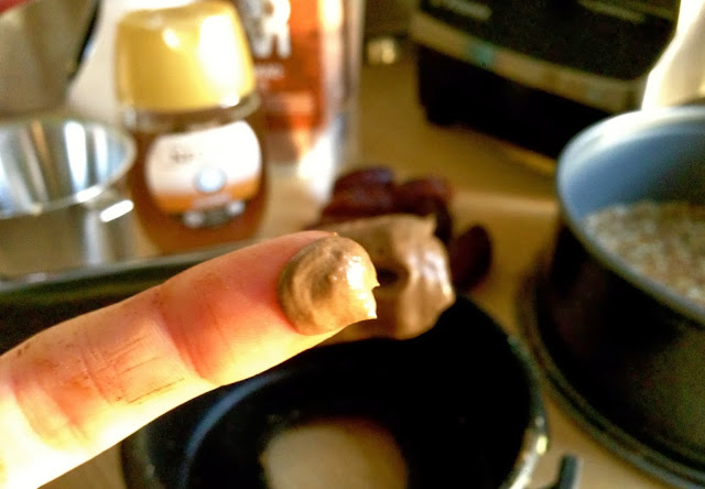 Kakun pohjan tein manteleista, joita liotin muutaman tunnin (en jaksanut odottaa kauempaa!), cashewpähkinöistä, medjool taateleista ja ripauksesta Kalaharin suolaa.