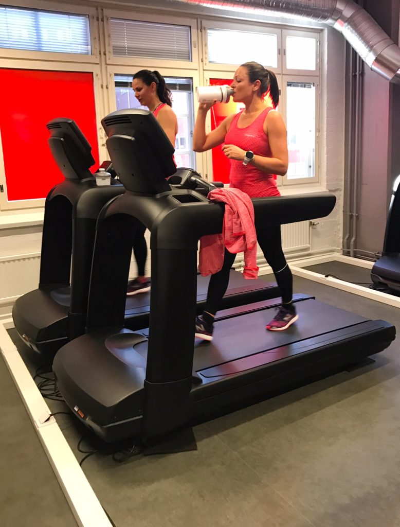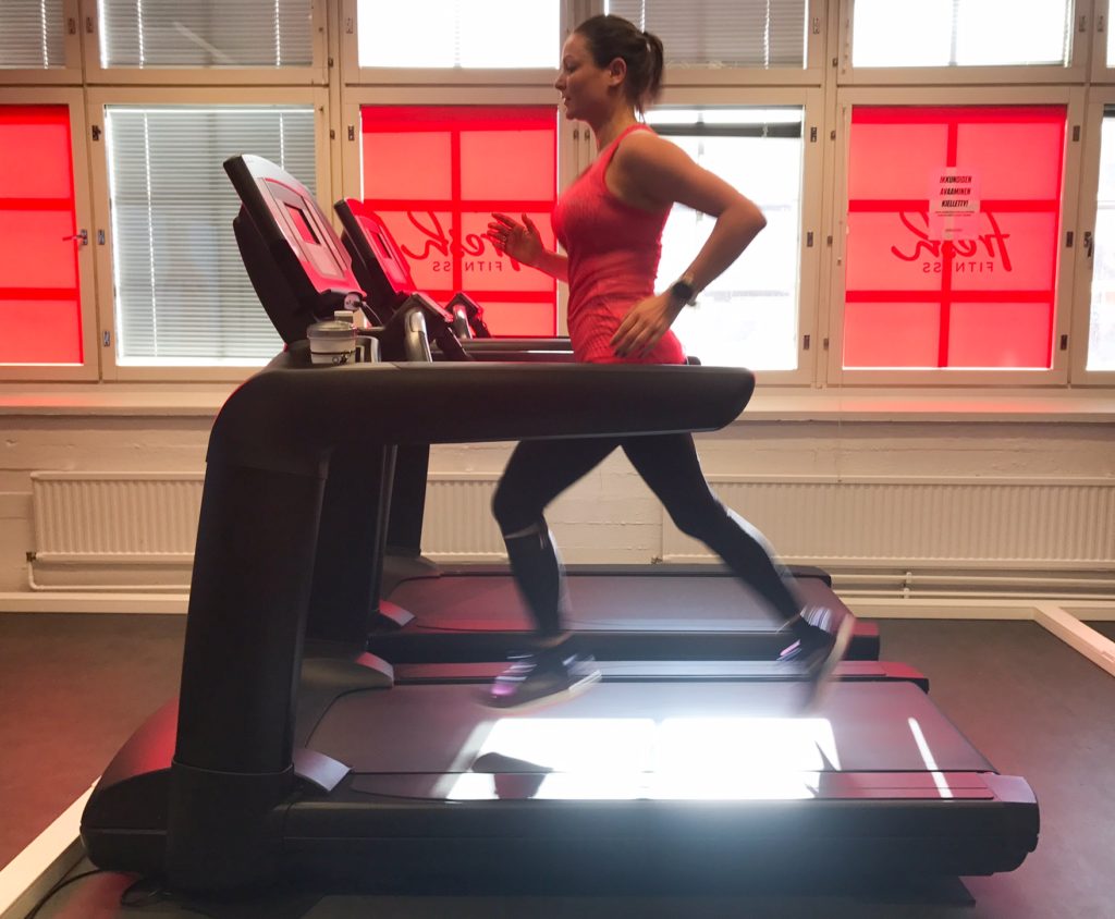 Kevyen alkulämmittelyn jälkeen juoksimme 5 min hieman 1/2 maratonvauhtia hiljempaa -> 5 min 1/2 maratonvauhtia -> 5 min hieman tavoiteaikaa kovempaa ja sama pyramidia alaspäin. Tämän jälkeen alkoi vasta “varsinainen” treeni; 3,0 inclinella 200m -> 400m -> 600m -> 800m -> 1000m -> 1200m, vetojen välissä 2 min palauttelu. Viimeisen vedon vedin niin kovaa, että olo oli kuin maratonin loppusuoralla. Syke jyskytti lähes 190:tä ja melkein tunsin aamun vihersmoothiet kurkussa. Luulin, että treeni oli tässä, mutta mitä vielä, pyramidi mennään tietenkin myös alaspäin. Huh, ei auttanut kuin kahden minuutin palauttelun jälkeen jatkaa 1000m -> 800m -> 600m -> 400m -> 200m. Loppua kohden pääsin sellaisiin endorfiineihin, että viimeisen vedon vedin väsymyksestä huolimatta 3.46min/km vauhtia ja jatkoin vielä extra 200 metriä. Kovemmissa treeneissä kannattaa ajaa itseään myös sinne epämukavuusalueelle.