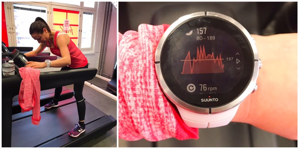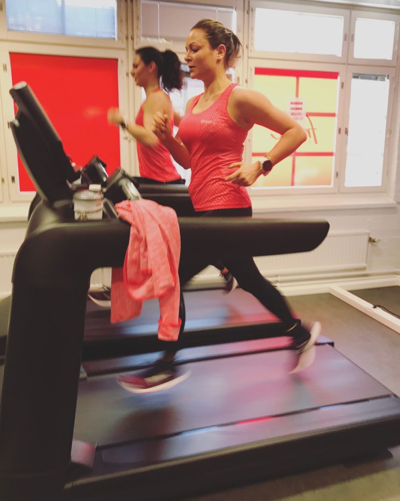 Kevyen alkulämmittelyn jälkeen juoksimme 5 min hieman 1/2 maratonvauhtia hiljempaa -> 5 min 1/2 maratonvauhtia -> 5 min hieman tavoiteaikaa kovempaa ja sama pyramidia alaspäin. Tämän jälkeen alkoi vasta “varsinainen” treeni; 3,0 inclinella 200m -> 400m -> 600m -> 800m -> 1000m -> 1200m, vetojen välissä 2 min palauttelu. Viimeisen vedon vedin niin kovaa, että olo oli kuin maratonin loppusuoralla. Syke jyskytti lähes 190:tä ja melkein tunsin aamun vihersmoothiet kurkussa. Luulin, että treeni oli tässä, mutta mitä vielä, pyramidi mennään tietenkin myös alaspäin. Huh, ei auttanut kuin kahden minuutin palauttelun jälkeen jatkaa 1000m -> 800m -> 600m -> 400m -> 200m. Loppua kohden pääsin sellaisiin endorfiineihin, että viimeisen vedon vedin väsymyksestä huolimatta 3.46min/km vauhtia ja jatkoin vielä extra 200 metriä. Kovemmissa treeneissä kannattaa ajaa itseään myös sinne epämukavuusalueelle.