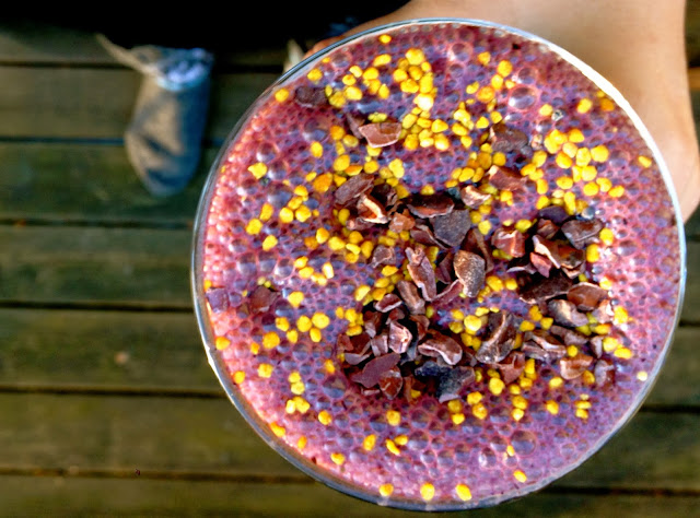 Iltapäivällä tein pitkästä aikaa smoothien, johon laitoin pinaattia. Banaani, pinaatti ja mustikat yhdessä on oikein maukas combo. Joukkoon vielä mitallinen Puhdistamon proteiinijauhetta sekä mantelimaitoa/vettä. Mehiläisen siitepöly on lopussa, joten sekaan koristeeksi laitoin myös kaakaonibsejä, jotka tuovatkin smoothieen kivaa purupintaa 🙂
