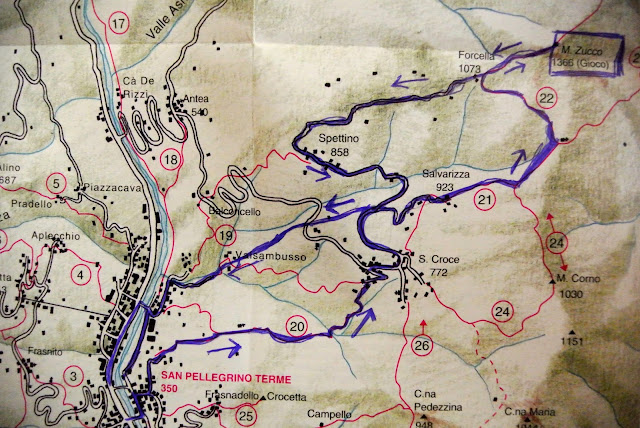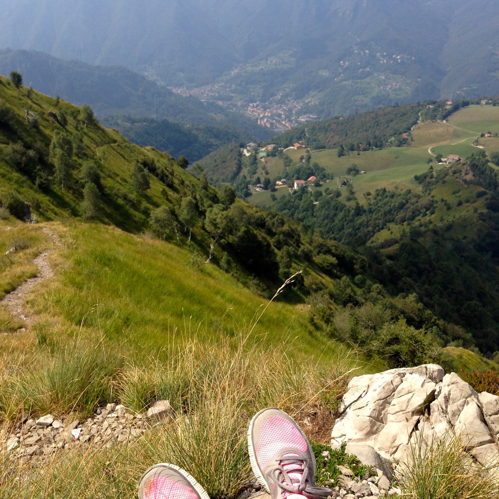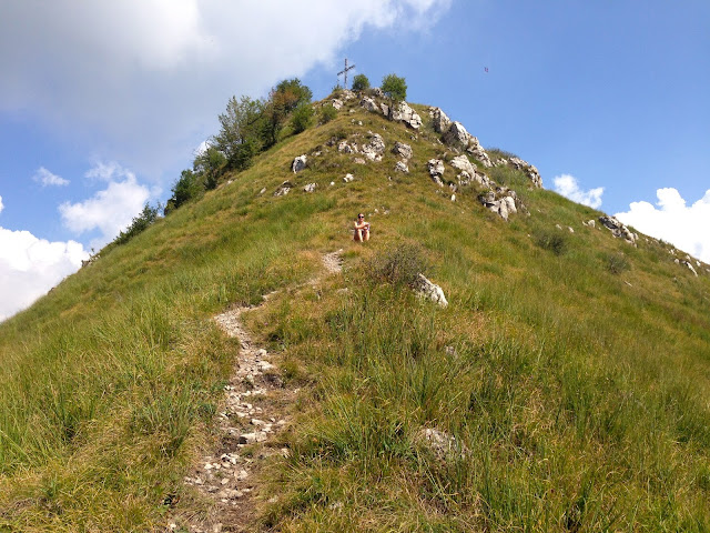 Vielä on matkaa huipulle. Tästä on vielä noin tunnin matka. Onneksi ystävällinen italiaano täytti vesipullot. Ei ehkä ihan fiksua lähteä vaellusmatkalle vain vesipullon ja kännykän kanssa. Tämä tuli tosin mieleen vasta siinä vaiheessa, kun alastulossa pientä polkua juostessa astuin ainakin metrin pituisen mustan käärmeen päälle! Apua, pelästyin niin paljon, että kiljuin niin kovaa, että huipun alapuolella olevan talon koiratkin alkoivat haukkua… Huh, ainakin kyypakkaus olisi hyvä olla aina mukana, ja ehkä vähän eväitäkin 😉