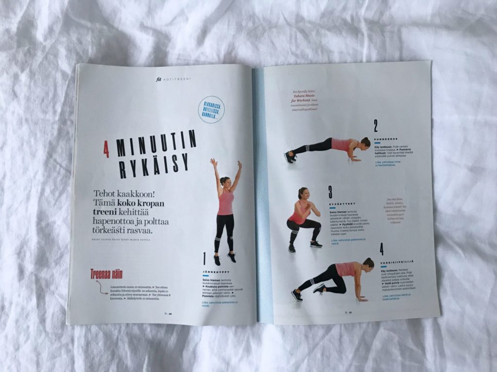 … kävin läpi vanhoja treenilehtiä, joiden joukossa oli iso kasa Fit-lehdelle muutama vuosi sitten suunnittelemiani kotitreenejä. Tämä neljän minuutin tabata neljällä perusliikkeellä on muuten super tehokas. Tee jokaista liikettä 20 sec, palauttele 10sec ja siirry seuraavaan ( esim. 20sec jännehyppy -> 10 sec palautus -> 20sec punnerrus -> 10sec palautus -> jne.). Jatka 4 min ajan. Pidä pieni tauko ja vedä vielä toisen kerran!