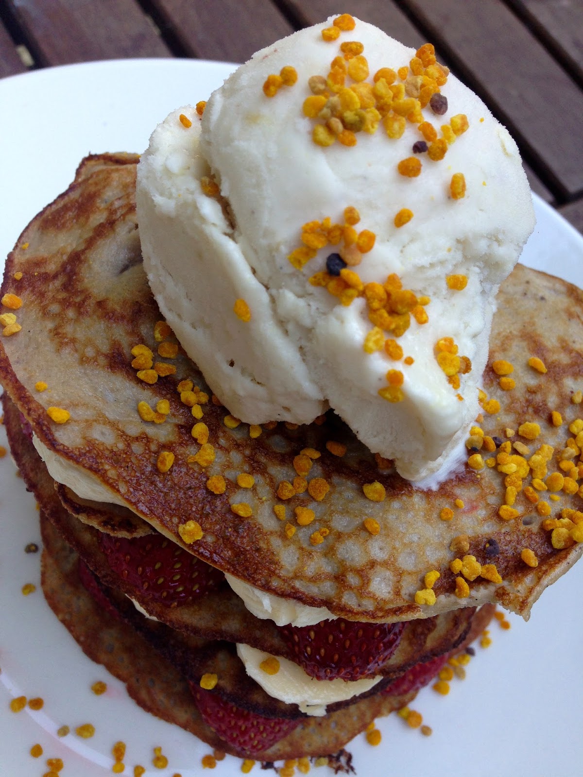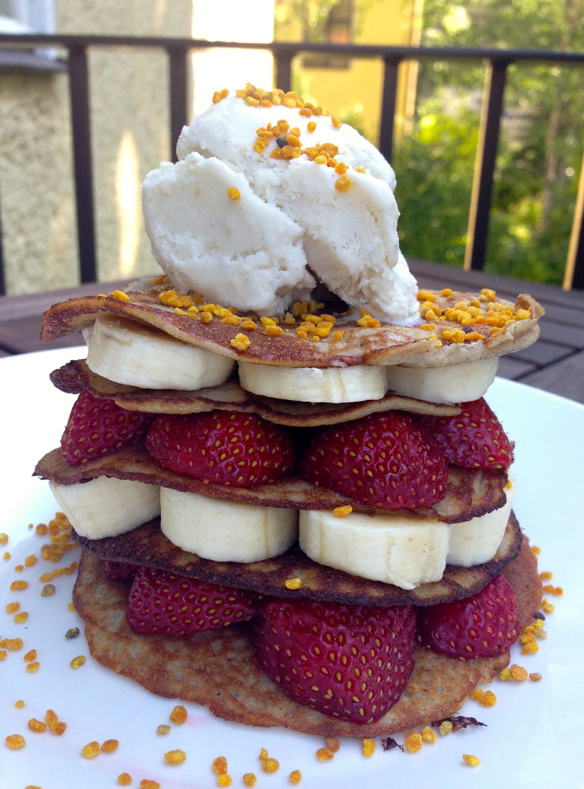 Tarjoile letut kotimaisten mansikoiden ja baanaanin kanssa. Paalla kirsikkana omatekemaa raakajaateloa ja mehilaisen siitepolyrakeita:)