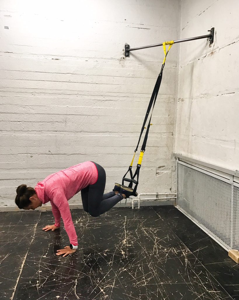 Aseta narut MC-korkeudelle eli lenkki roikkuu noin puolen säären korkeudella. Laita jalkapöytä lenkkiin ja asetu lankkuun. Jos liike tuntuu liikaa ranteissa, voit asettua myös kyynärnojaan. Paina kevyesti kämmenillä lattiaa vasten. Hyvässä lapatuessa lavat ovat leveällä. Kiinnitä huomio myös hyvään keskivartalon aktivointiin- alaselkä ei saa lähteä notkolle! Katse käsien väliin. Lankusta tuo vuorotellen hallitusti polvea käsien väliin. Toista 5x per polvi tai niin monta kuin saat keskivartalon pidettyä hallinassa.