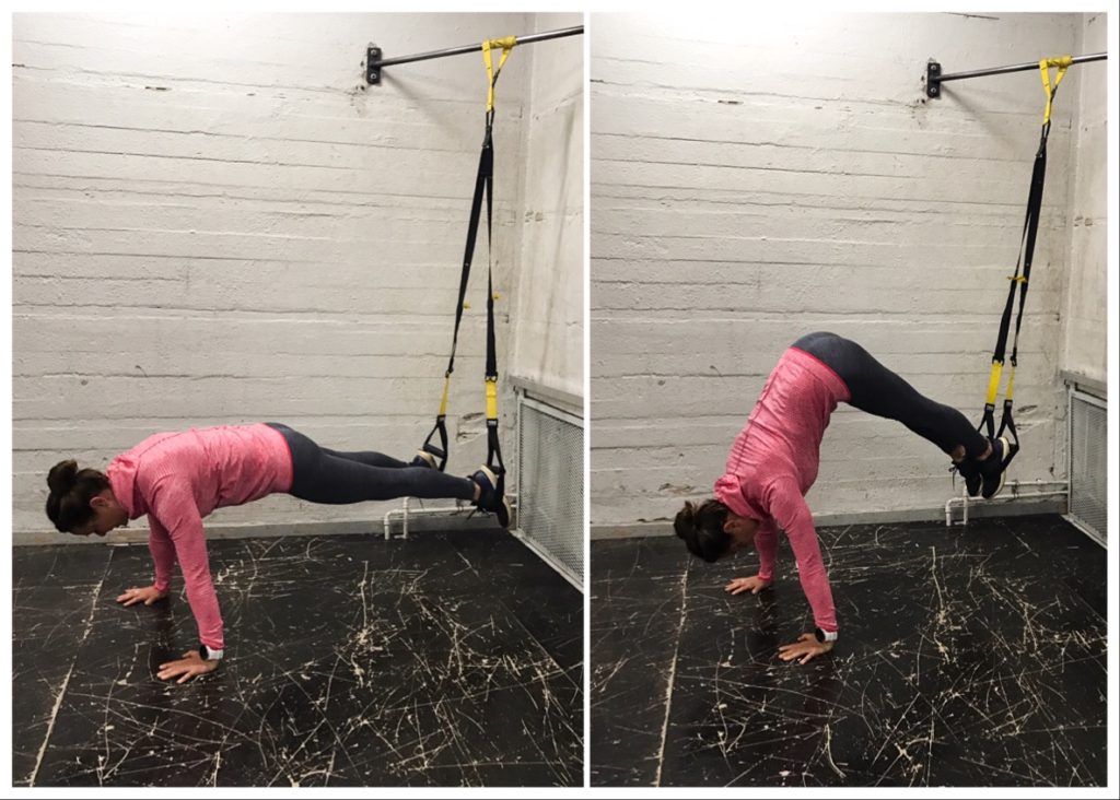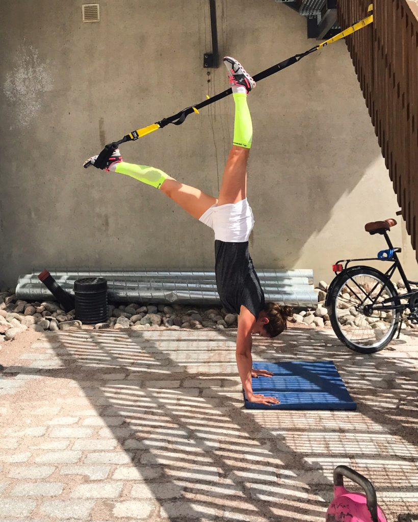 Ei siis kannata testata yllä olevan kuvan käsilläseisontaa, jos et a) ole ennen harjoitellut käsillä seisontaa b) käyttänyt TRX-naruja c) et tiedä, mikä on lapatuki ja hyvä keskivartalon tuki (alaselkä ei saa lähteä notkolle!) tai d) et tiedä, mitä olet tekemässä ja miksi. Mutta sen sijaan, jos lankku sujuu jo helposti, voit testata alla olevia lankkuvariaatioita narujen avulla. Liike vahvistaa hyvin niin käsien lihaksia kuin keskivartaloa ja sen hallintaa.