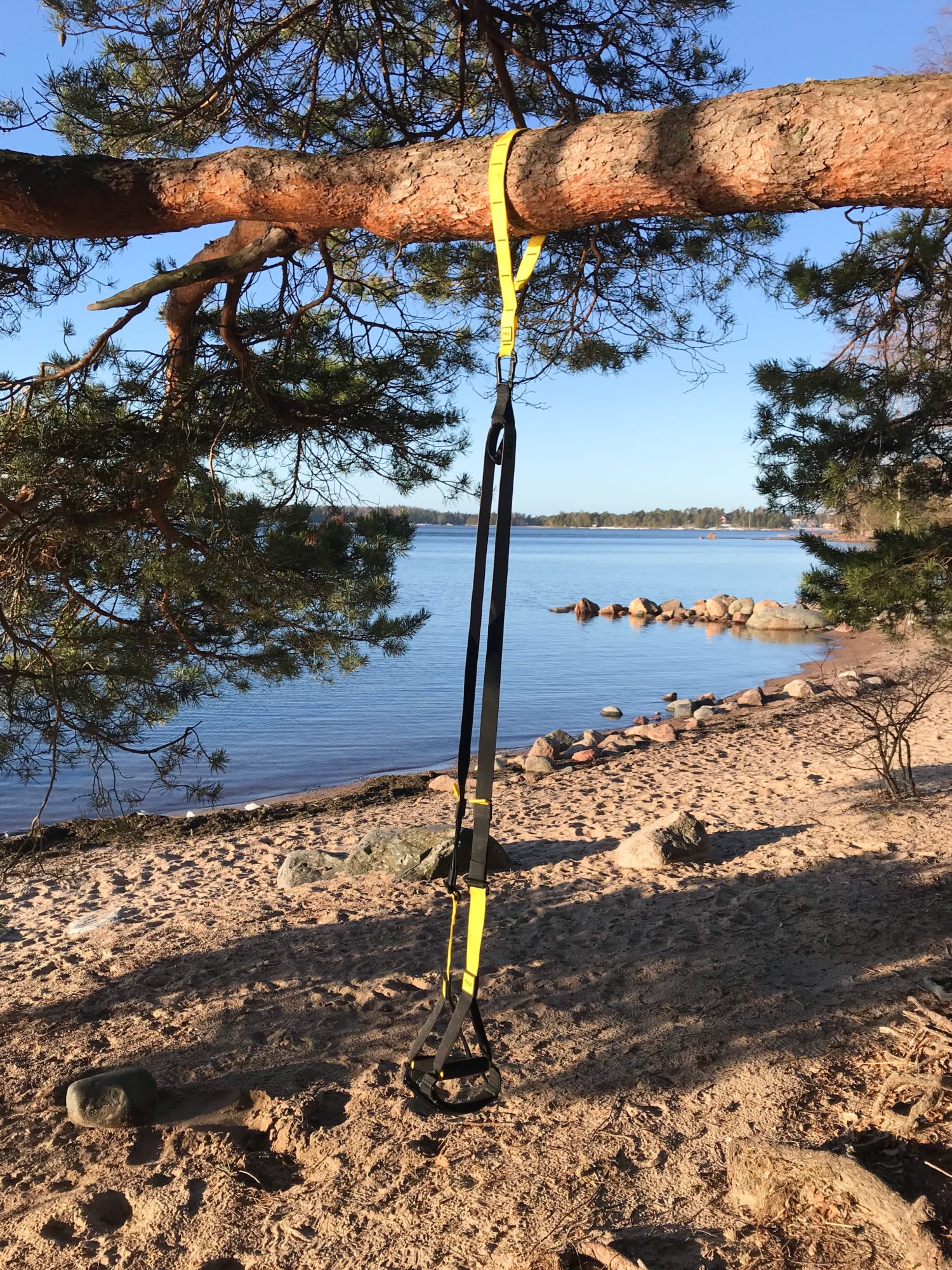 Perjantaina työmatkajuoksua kertyi yhteensä 16 kilometriä ja viikon pitkikseni juoksin näin ollen osissa. Aurinko paistaa porotti Haukilahteen hölkötellessä, vaikka muuten kylmä tuuli tekikin ilman melko viileäksi. Juostessa ei kylmä tietenkään tuntunut ja ohjauksen ajaksi vedin lämmintä vaihtovaatetta päälle. Olipa muuten mielettömät maisemat ripustaa TRX-narut talven jälkeen taas ulos ja treenata asiakkaiden kanssa ulkona.