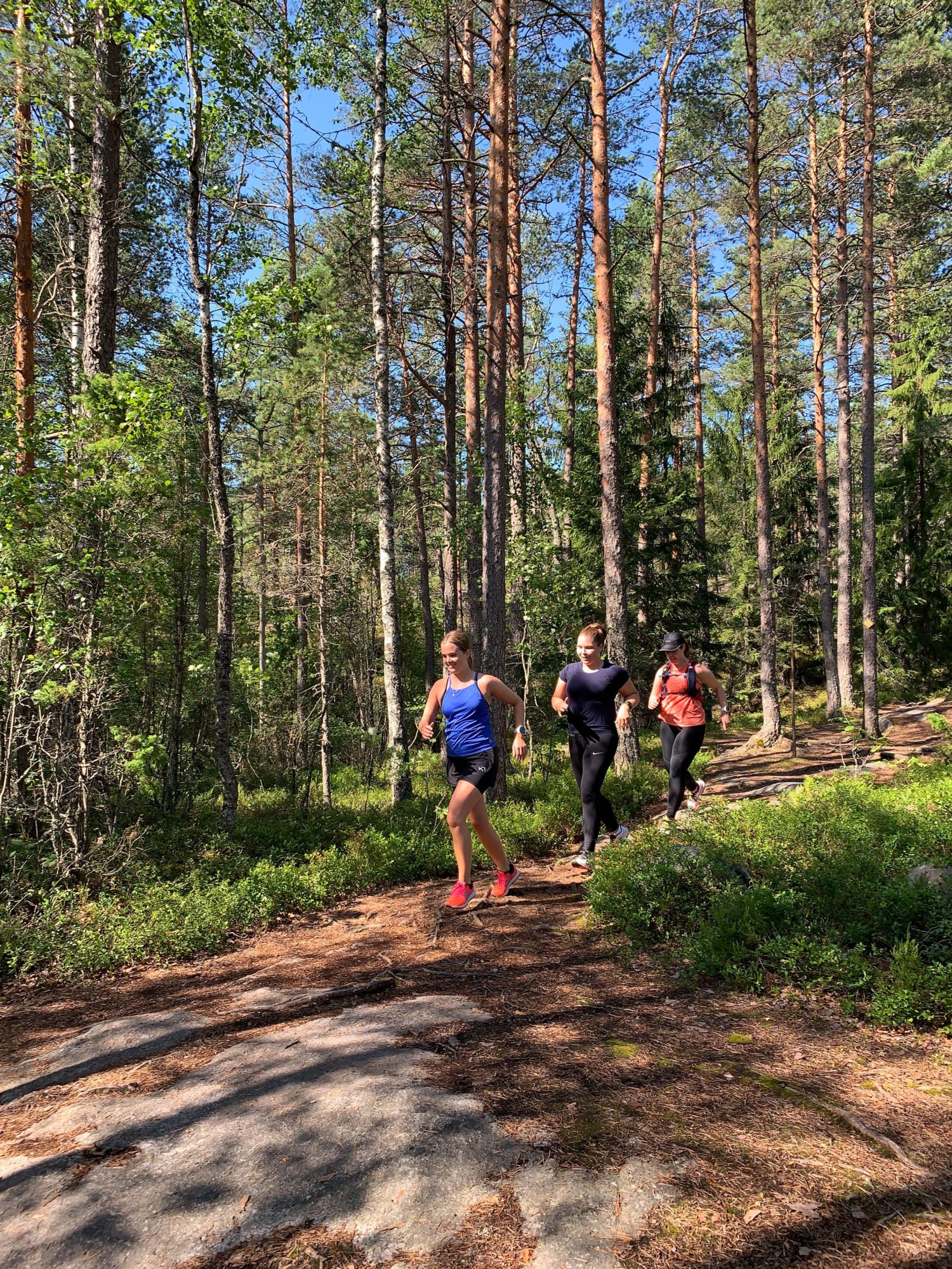 Torstaina kävimme juoksutiimimme kanssa Nuuksiossa päiväretkellä. Jätimme autot Haukkalammelle ja juoksukävelimme pari kolme tuntia polkuja pitkin. Punarinnan kierroksen kautta Korpinkierrokselle ja lopuksi vielä Haukankierros. Kauniita metsäreittejä kaikki, jotka on hyvin merkitty. Aika meni todella nopeasti jutellessa, ja nyt on syksylle asetettu uudet tavoitteet- ensin elokuussa Paavo Nurmi 1/2 maraton ja lokakuussa lähdemme Pirkan Hölkälle. Polkujuoksun suosio on koko ajan kasvamassa, eikä ihme, metsässä pääsee irti kaikesta, aivan kuin astuisi maailmaan, missä ei ole kiirettä tai velvollisuuksia.