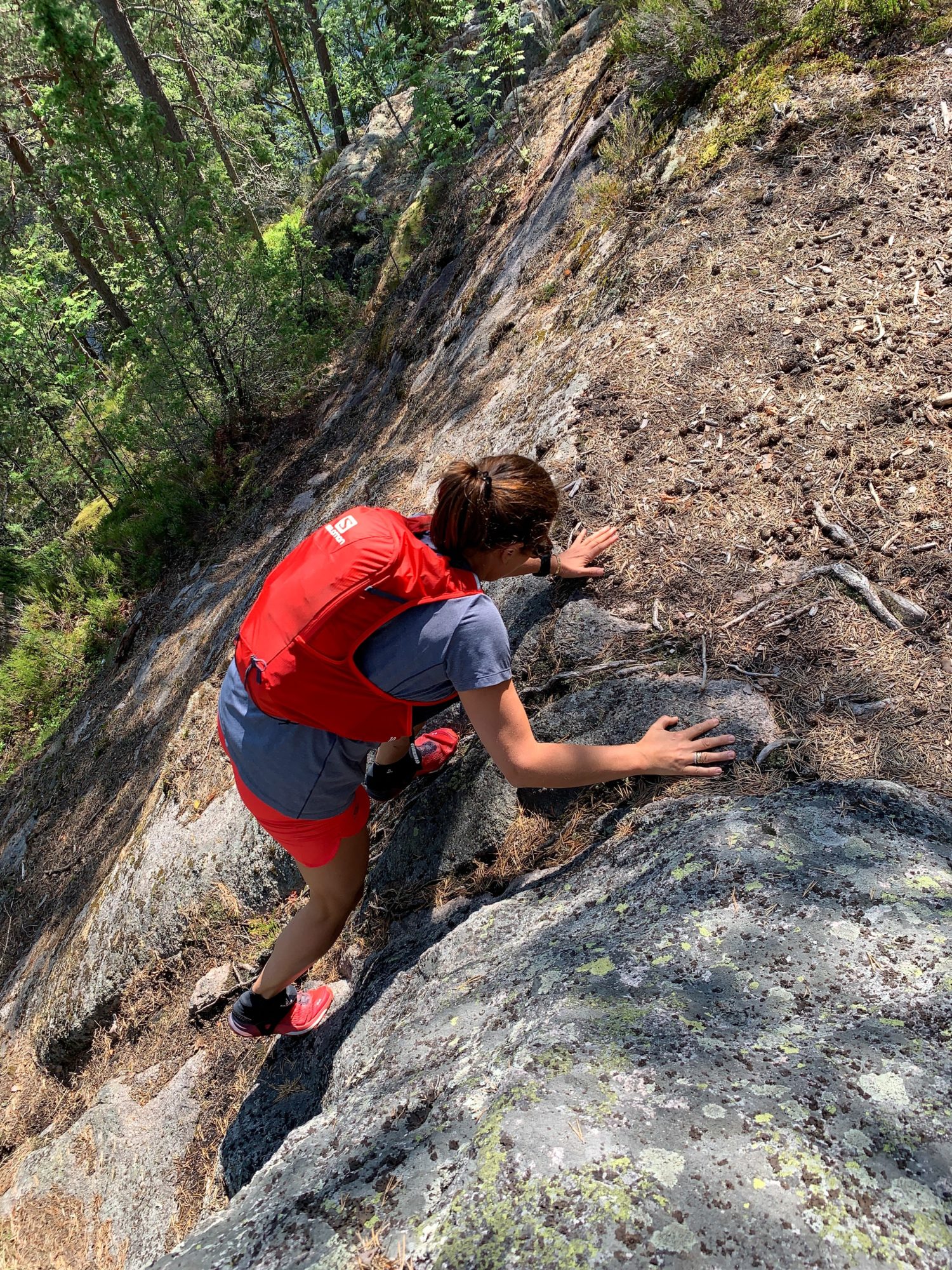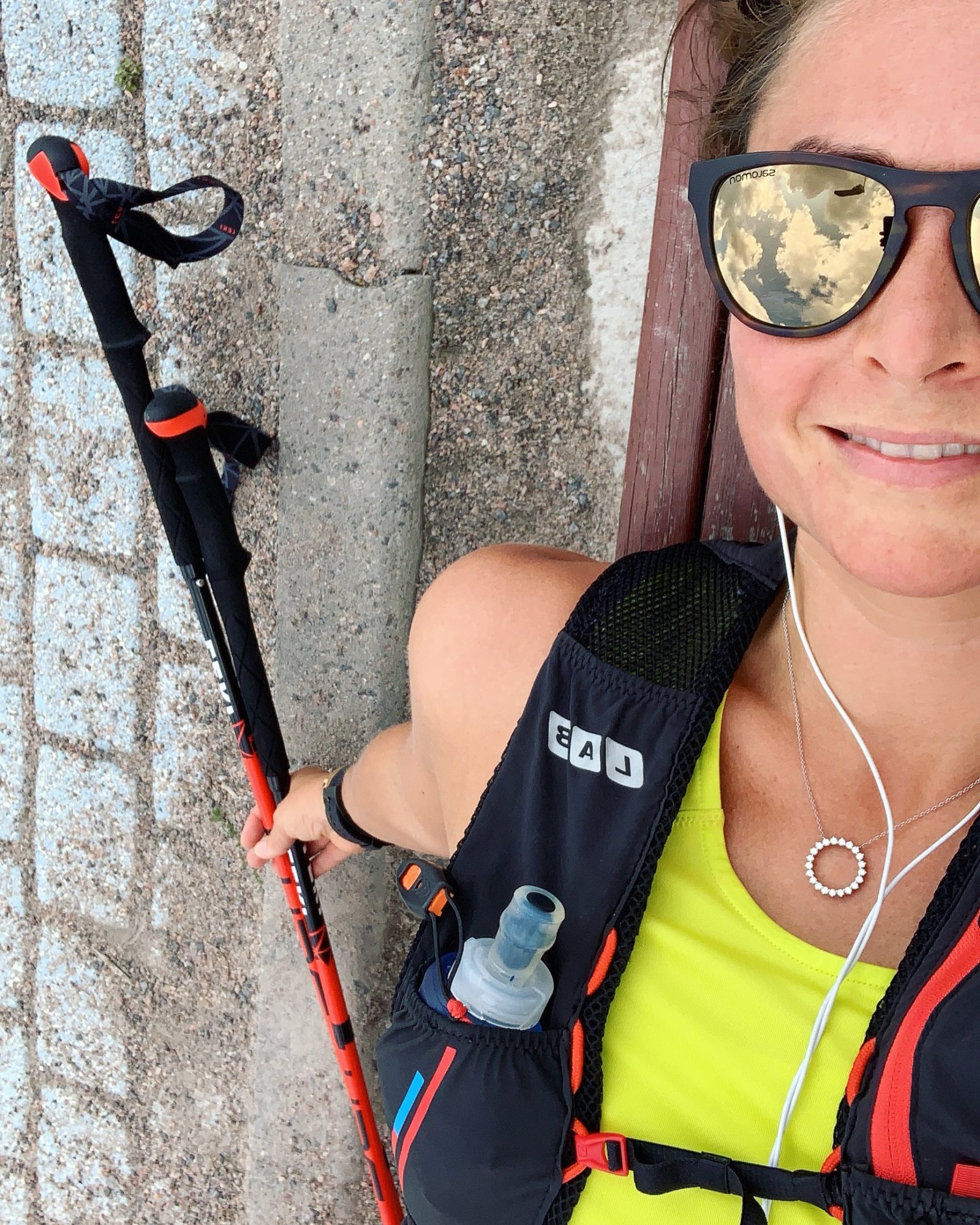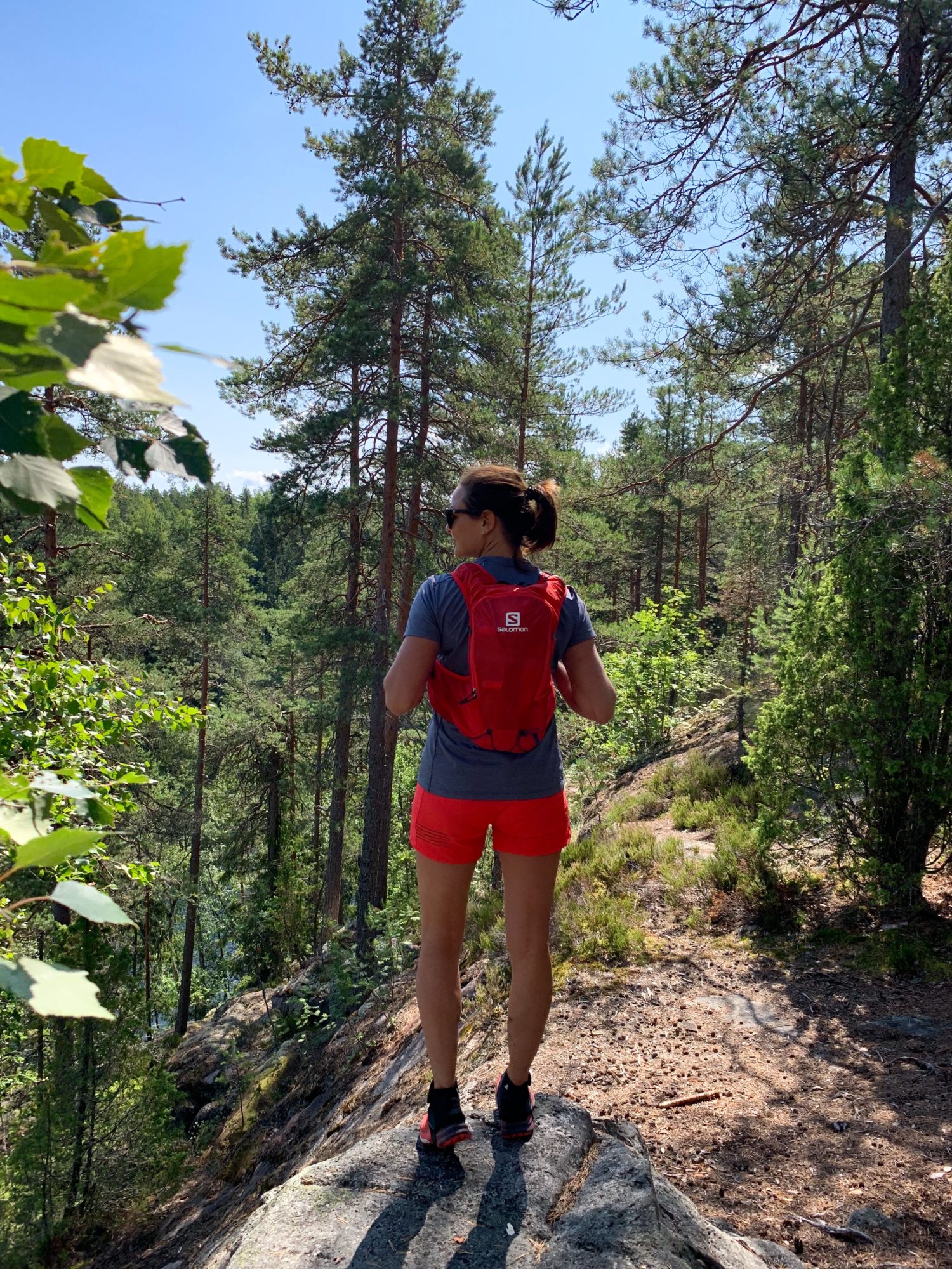 Päälle: t-paita, shortsit, sukat, Salomon Ultra 2 polkujuoksutossut, geiterit (nilkkasuojat), Suunto 9 baro urheilukello, lippis, aurinkolasit, Salomon Skin Pro 10 reppu, 2 tai 3 x 0,5l lötkövesipulloa + Leki sauvat