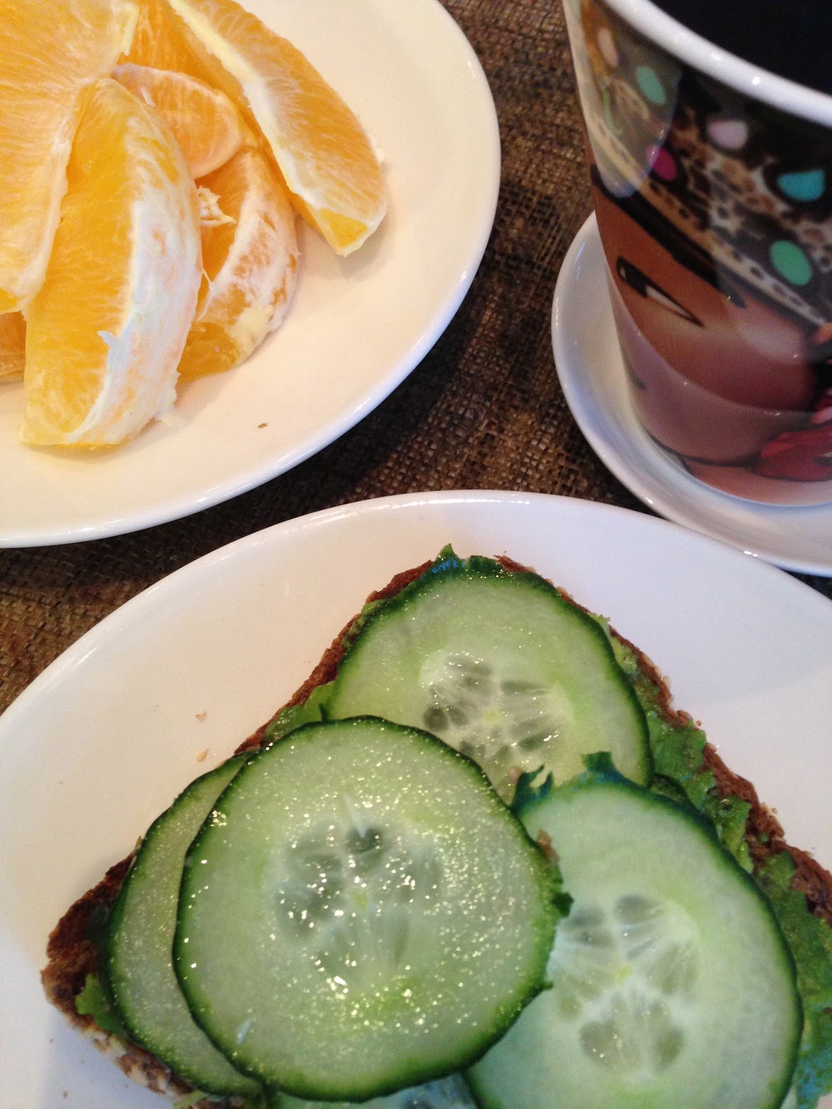 Today I had some orange slices with avocado/cucumber toast. I don’t usually like to eat bread in the morning, but if I have, I like to spread some avocado on it! If you haven’t tried it yet, you have to! Its so yummy, and filled with good fats!