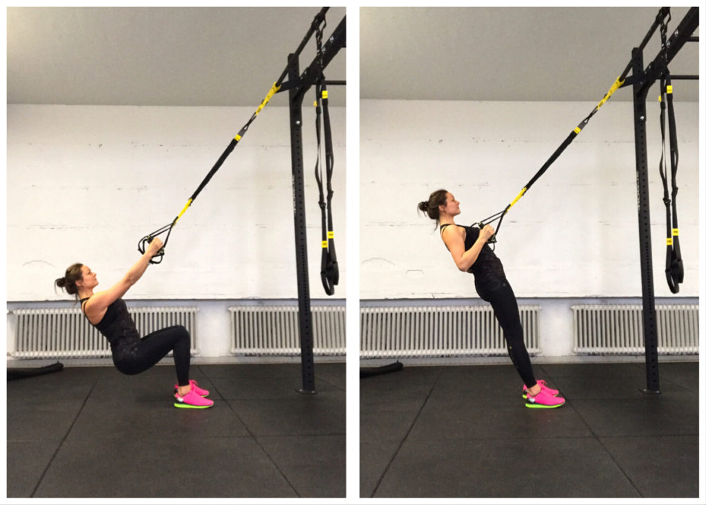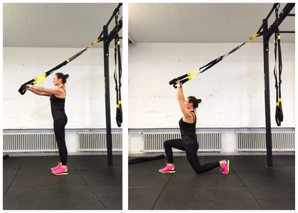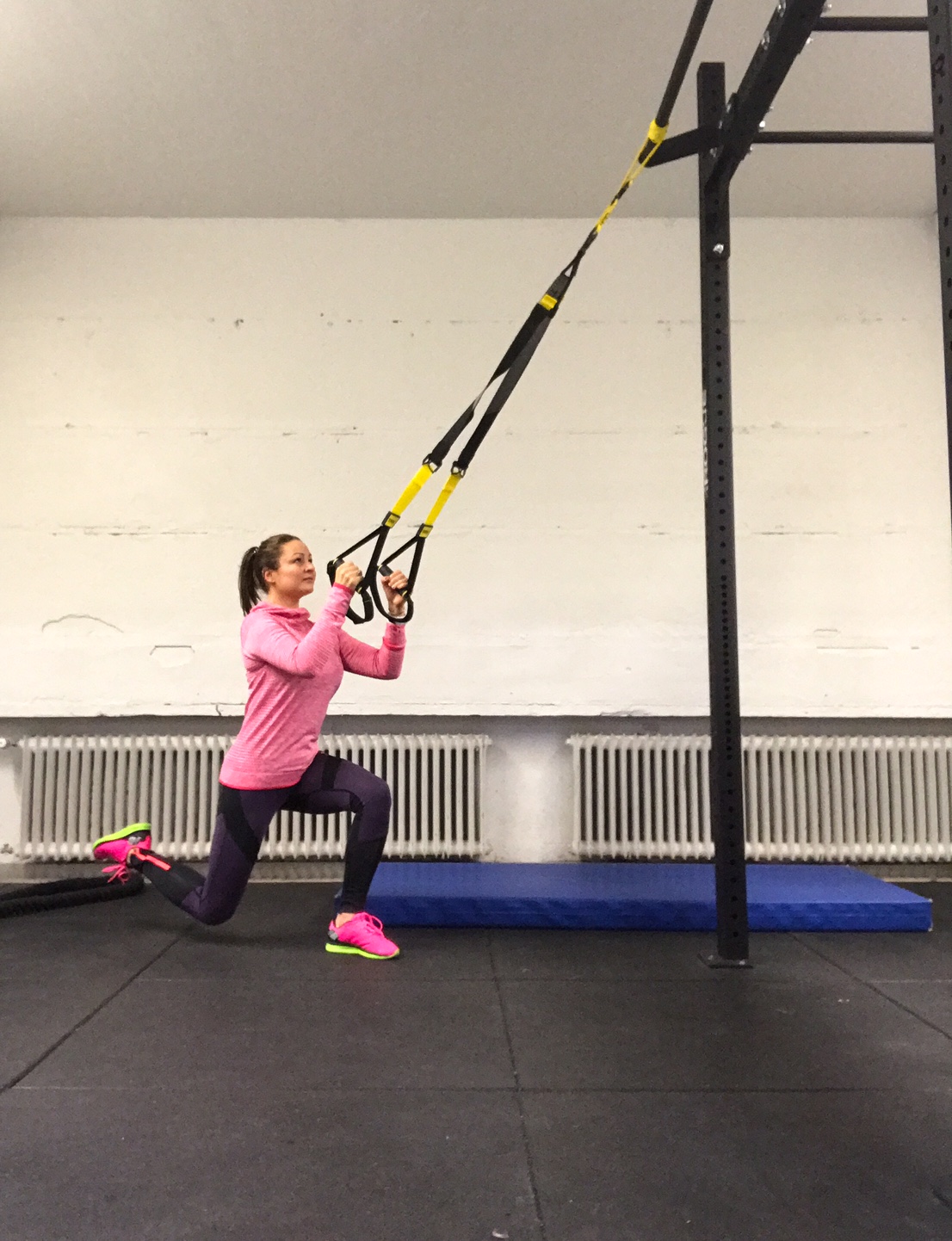 Liike vahvistaa jalkojen lihaksia, keskivartalon hallintaa ja tasapainoa. Mitä kevyemmin pidät käsillä kahvoista kiinni, sitä enemmän jalat tekevät töitä. Asetu katse ankkuriin päin, seiso ryhdikkäästi kyynärpäät kyljissä. Astu askel taakse niin, että molemman jalan polvet ovat noin 90 asteen kulmassa. Ponnista tukijalan kautta lähtöasentoon ja tee sama toisella jalalla. TAI niin kuin kuvassa, eli tuo astuvan jalan polvea taakse kohti lattiaa, ponnista tukijalalla lähtöasentoon ja toista samalla jalalla haluttu toistomäärä. Tämä on huomattavasti haastavampi versio ei siis aloittelijoille.