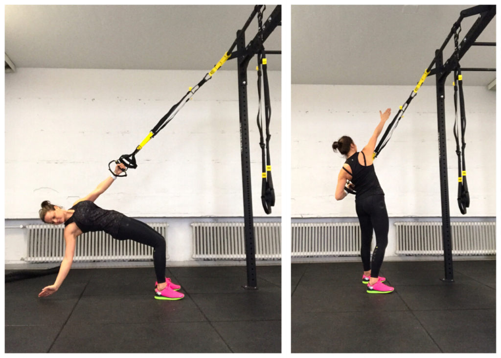 Liike vahvistaa tehokkaasti keskivartaloa lisäten kylkien liikkuvuutta. Tässä sama “lukko” käsikahvoissa kuin edellisessä liikkeessä. Asetu sivuttain ankkuria kohden, ankkuriin päin oleva jalka edessä. Ota kahvoista kiinni ja tuo kädet pään päälle, kyynärpäät osoittaen sivuille. Kädet pysyvät koko liikkeen ajan tiiviisti pään päällä. Tiputa lantiota hallitusti sivulle ja nosta lähtöasentoon keskivartalon avulla. Toista ja tee sama toiselle puolelle.