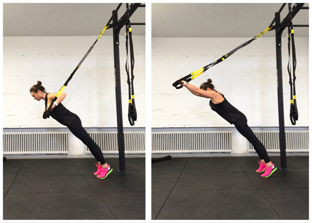 Liike vahvistaa kokonaisvaltaisesti koko kehoa. Asetu katse ankkuriin päin, hieman taaksepäin nojaten- mitä lähemmäksi astut ankkuria eli kiinnityslukkoa, sitä haastavampi liike on. Kyykkää, ponnista lähtöasentoon kiinnittäen huomio ettei lantio tipahda ja tee soutu eli vedä kyynärpäitä kylkiä kohti.