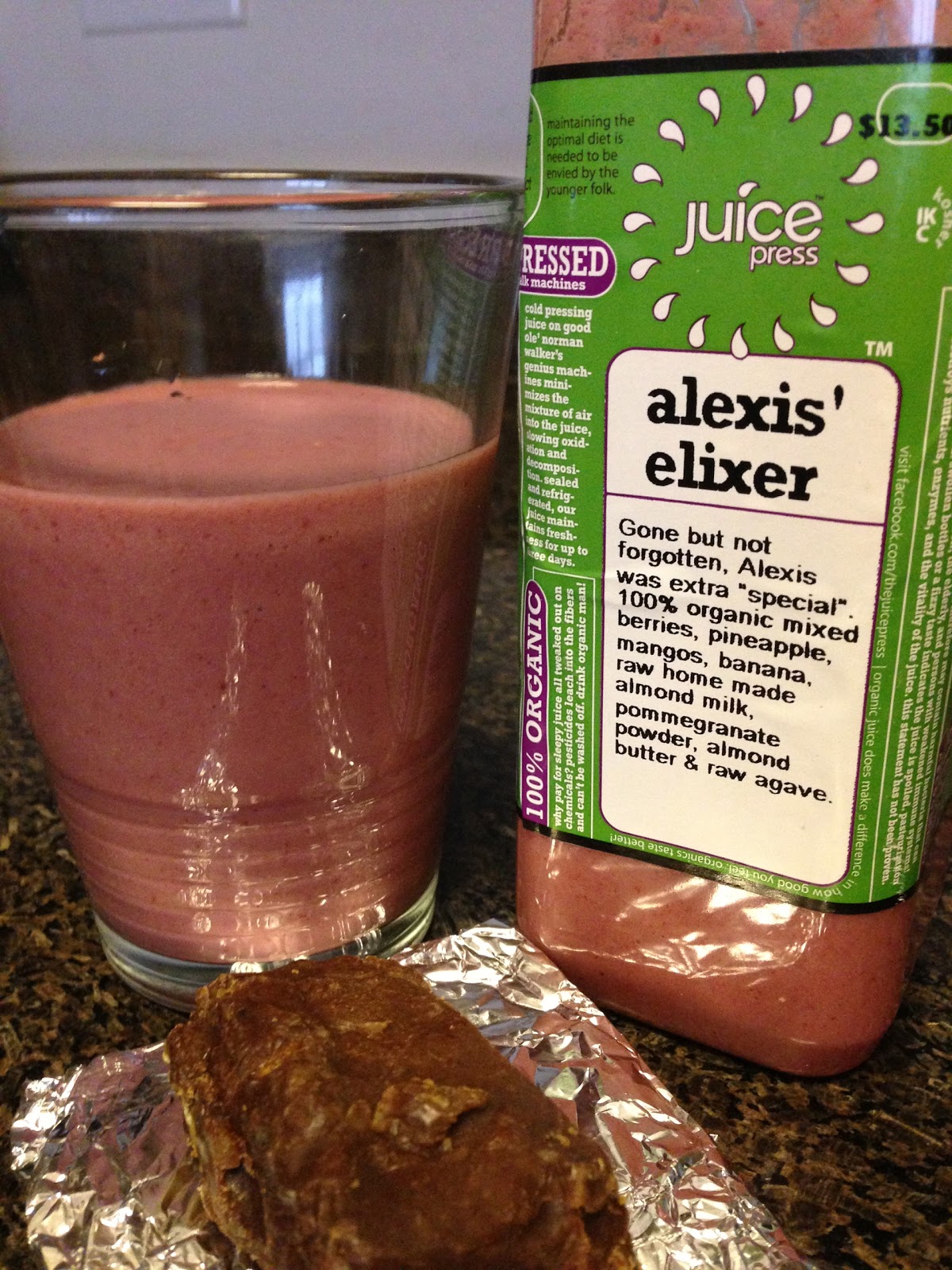 | Post- exercise meal! Smoothie and my homemade proteinbar! Hmmm… that protein bar doesn’t look as good as it tastes! 😉 |