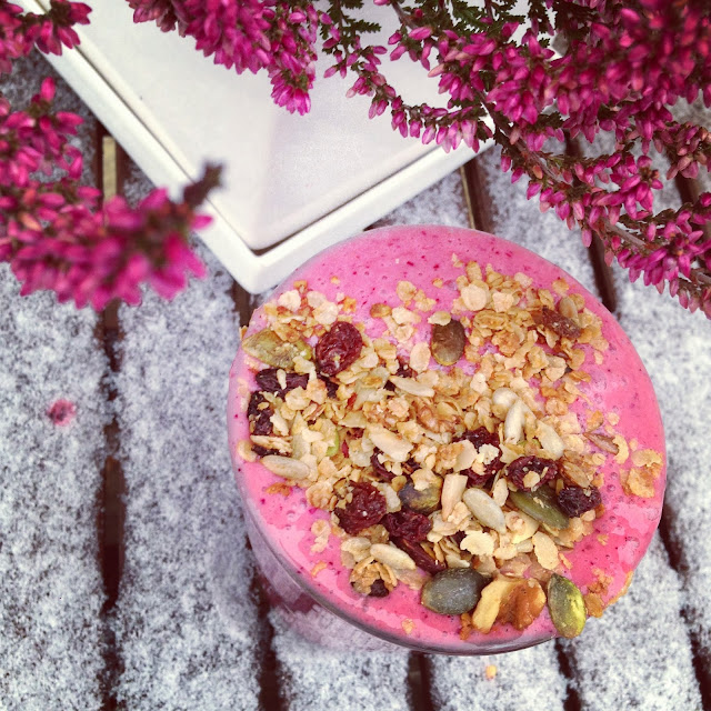 Talvella myös smoothiet muuttuvat kauden mukaisiksi. Tässä smoothiessa pääroolissa on karpalo. Tätä ihanan kirpsakkaa terveyspommia, jota on perinteisesti käytetty virtsatulehduksien hoitoon, on pakastin pullollaan. Hyvä niin, sillä tätä smoothieta tulee varmasti tehtyä vielä moneen kertaan. Mansikoiden tilalla voit hyvin käyttää mitä tahansa marjaa; mustikoita, vadelmia, lakkaa… mutta mielestäni juuri mansikka tuo mukavaa makeutta kirpeän karpalon vastapainoksi. Mitat ovat vain suunnilleen mittoja, sillä yleensä laitan aineksia mutu-tuntumalla. Sitten vain lisään nestettä sen mukaan minkälaisen koostumuksen haluan. Yleensä smootheissa käytän mantelimaitoa, mutta kookosmaito tuo myös kivaa vaihtelua.