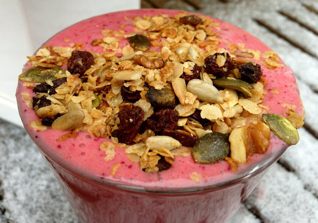Päälle omatekemää mysliä/ Topped with home made muesli.